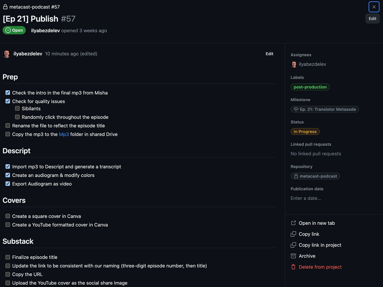 This is a slice of the checklist from the “Publish” task. A lot of steps are needed to produce a simple indie podcast like ours.
