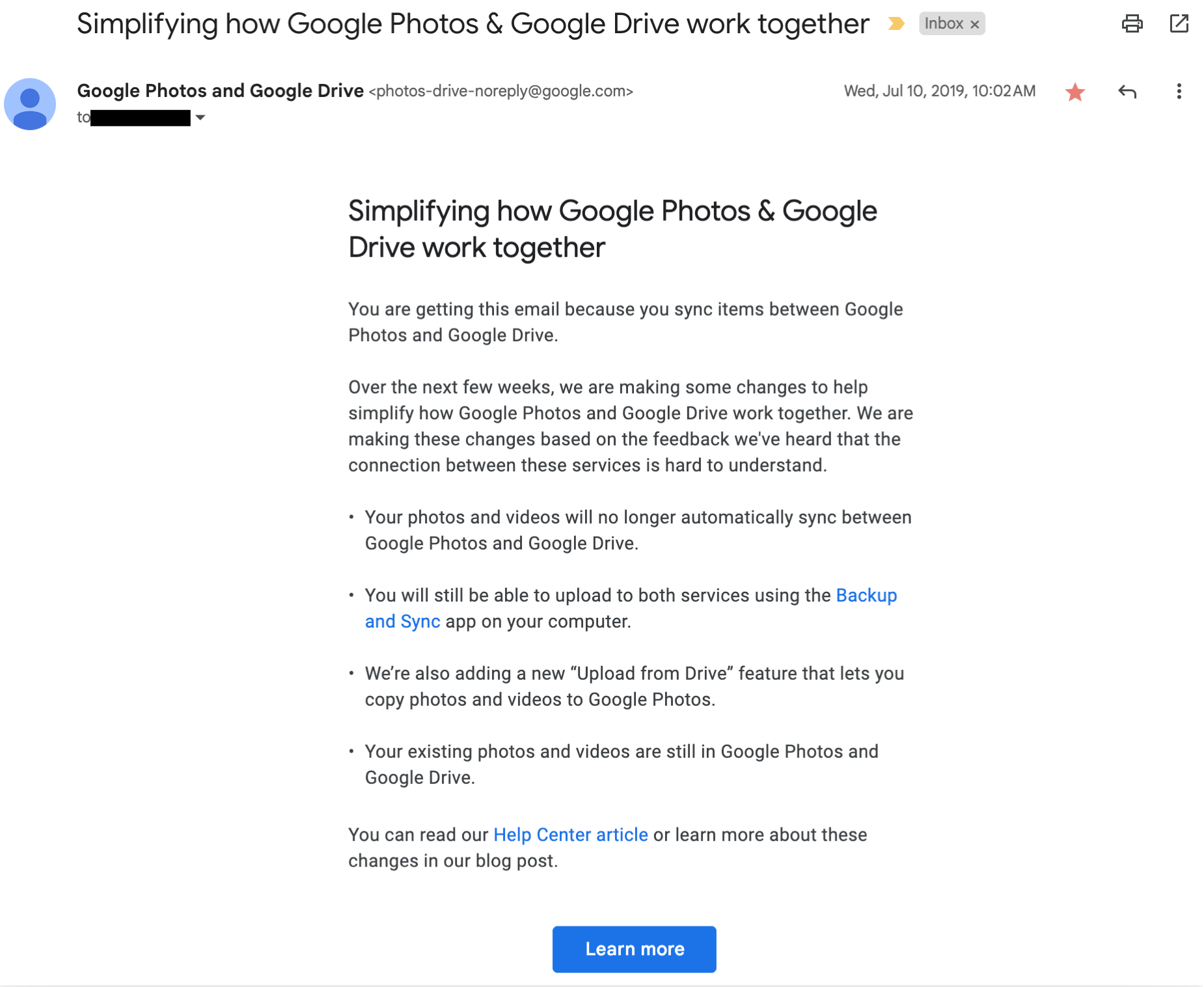 The email from Google stating that they’re simplifying the Google Photos and Google Drive experience by deprecating the feature I depended on.