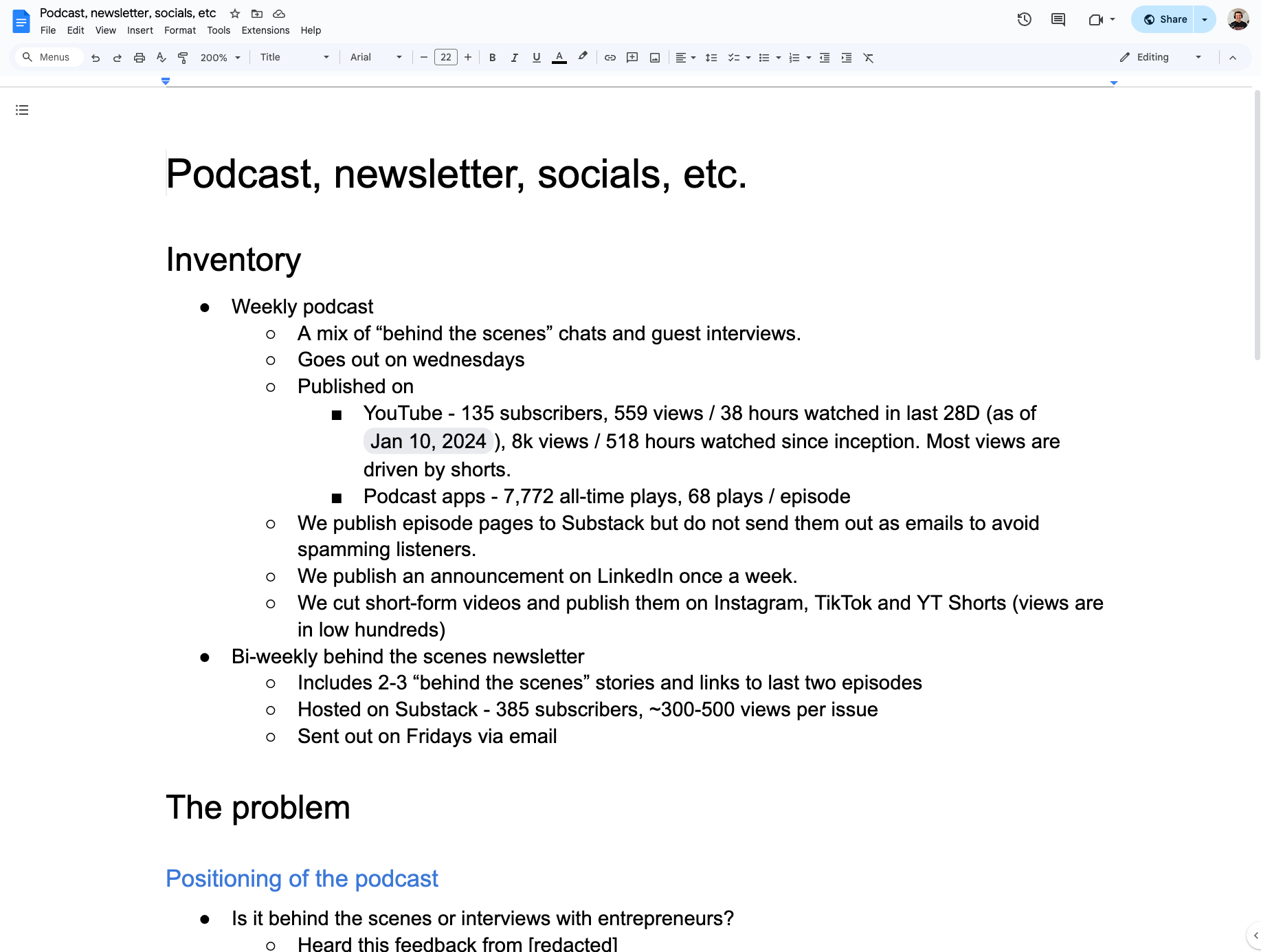 It dawned on me that the effort we’re putting into content creation is higher than the ROI. I believe one of the root causes is the positioning of the podcast — is it a podcast about building Metacast, or is it a podcast about entrepreneurship in general? It’s both, which also means that it’s neither, because you can’t be everything for everybody.