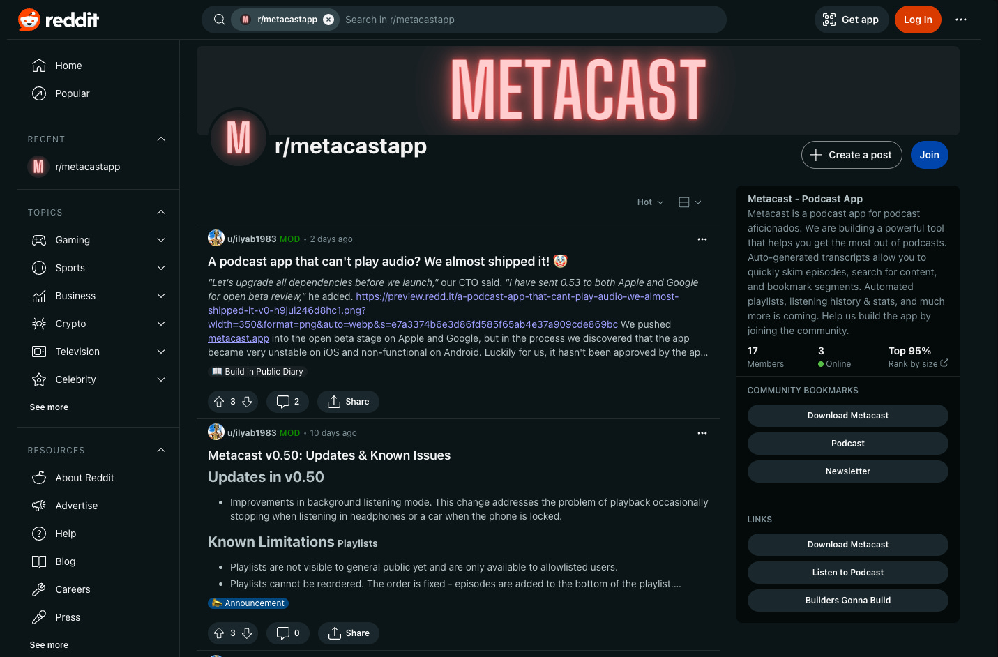 Please report any issues, request features or just stop by to say hi in our subreddit r/metacastapp or via email feedback@metacast.app.