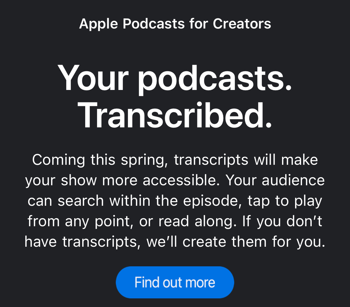 I got an email from Apple that said they were going to introduce transcripts to Apple Podcasts. I had a moment of panic, because most of the novelty of Metacast is centered around episodes having transcripts that you can read, search, bookmark, and share.