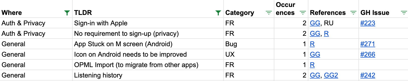 We have a Google Sheet where each row is “feedback” — it has a very brief description (5-7 words, like “Apple phones heat up”), how many users reported the issue, and links to those reports (in Reddit or Google Groups).