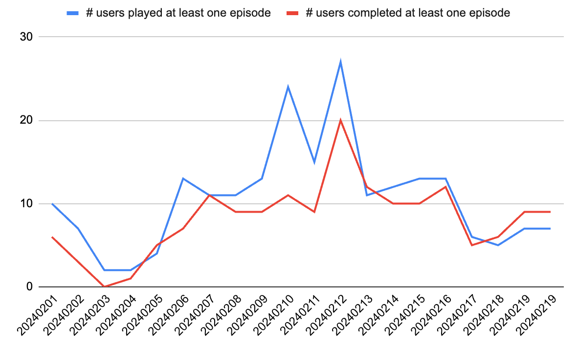 We define a daily active user as a user who played at least one episode. We also track how many users completed at least one episode that day and how many episodes were played and completed in total. We’re yet to define a north star engagement metric like “if they played X episodes within Y days, they’re a customer for life.” That will come later.